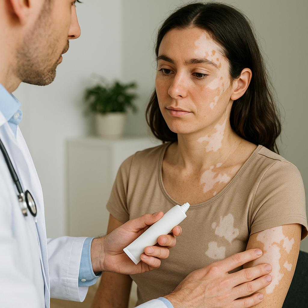 Витилиго – это кожно-дерматологическое заболевание, проявляющееся белесыми пятнами на некоторых участках кожи. Появление этих пятен обусловлено исчезновением нормального пигмента в коже, речь идет о выработке меланина в организме. Витилиго считается довольно редко встречающимся заболеванием и причина образования витилиго до сих пор неизвестна. Наиболее вероятной причиной этого заболевания принято считать нервно-эндокринные расстройства. Однако известно, как лечить витилиго, помните, что витилиго — не приговор. Про другие виды пигментных пятен и причины их появления, читайте тут.
