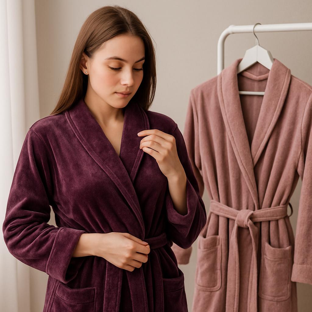 Велюр — приятная на ощупь, бархатистая ткань с мягким густым ворсом. Сшитые из него халаты, выглядят современно, ярко и нарядно. Характерный блеск и насыщенность оттенков делают велюровые халаты очень красивыми. Комфорт и удобность в ходе носки обеспечивает способность ткани пропускать воздух и сохранять тепло.