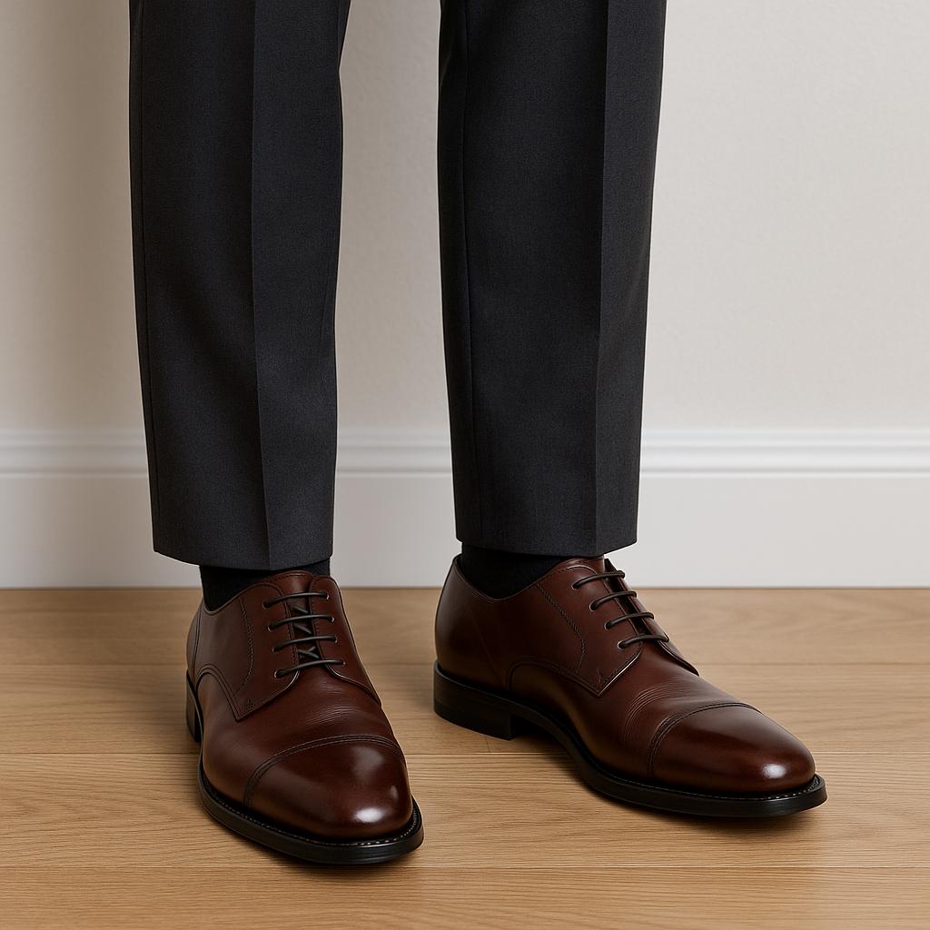 - Брюки как мужские, так и женские должны быть в обязательном порядке подобраны соответственно высоте каблука, ни в коем случае не должен быть виден шов, между каблуком и колодкой.